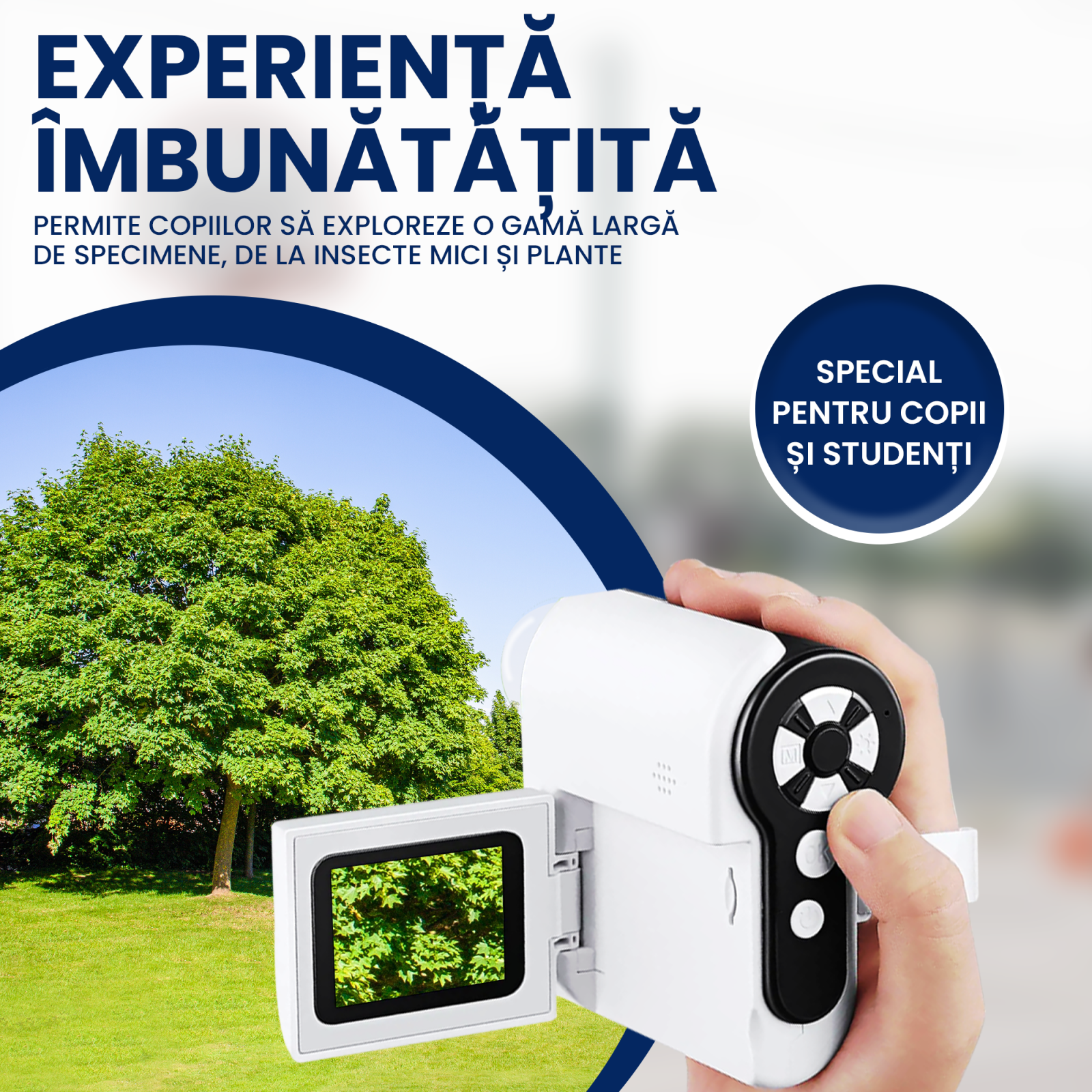 Cu un zoom de până la 1000x, copiii pot observa detalii invizibile ochiului liber: structura frunzelor, insecte sau textile.