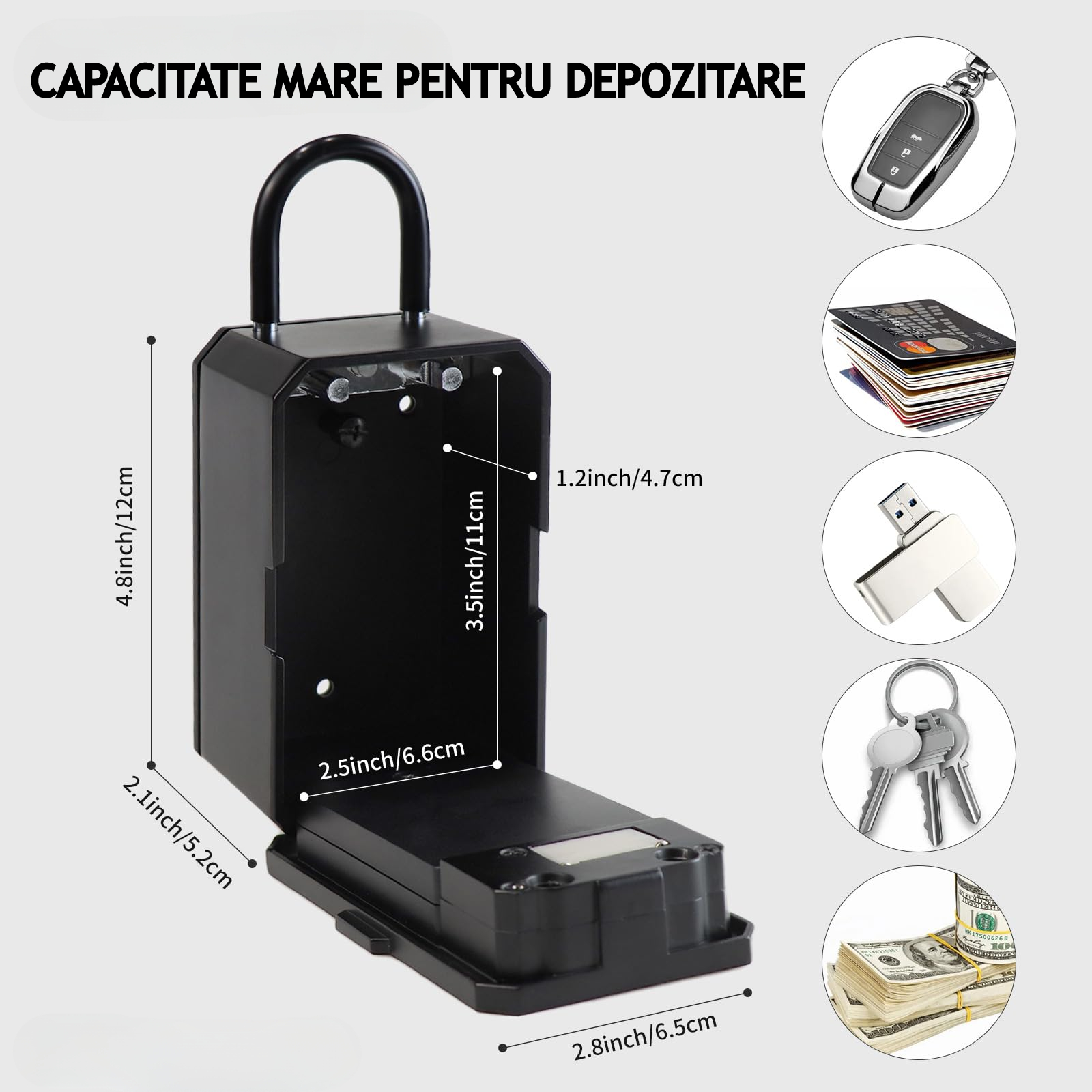 Cutia dispune de dimensiuni considerabile, oferind suficient spatiu pentru a stoca chei, carduri, documente sau alte obiecte de valoare. Aceasta caracteristica este ideala pentru utilizatorii care au nevoie de o solutie de depozitare versatile si spatioasa.
