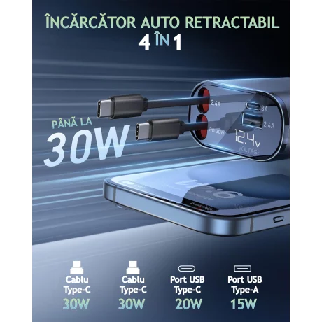 | Functii: | Incarca telefoanele si dispozitivele mobile prin conectarea la priza pentru bricheta masinii, Design ergonomic, Usor de utilizat, Permite incarcarea simultana a 4 dispozitive, Design compact , Retractabil, Previne supraincalzirea, Orientare ajustabila, Afisaj digital, Fast Charging, Protectie temperatura, Previne supraincarcarea |
