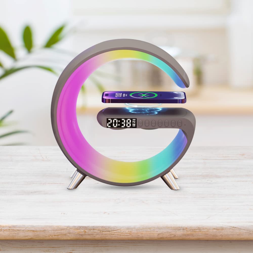 Lampa Smart LED RGB si Incarcator Wireless 15W Ventlex®, Lumini Ambientale, Sincronizare muzicala, Difuzore 3W, Bluetooth, Afisaj Ceas Digital, Alarma plus simulare rasarit, Control prin aplicatie, Negru