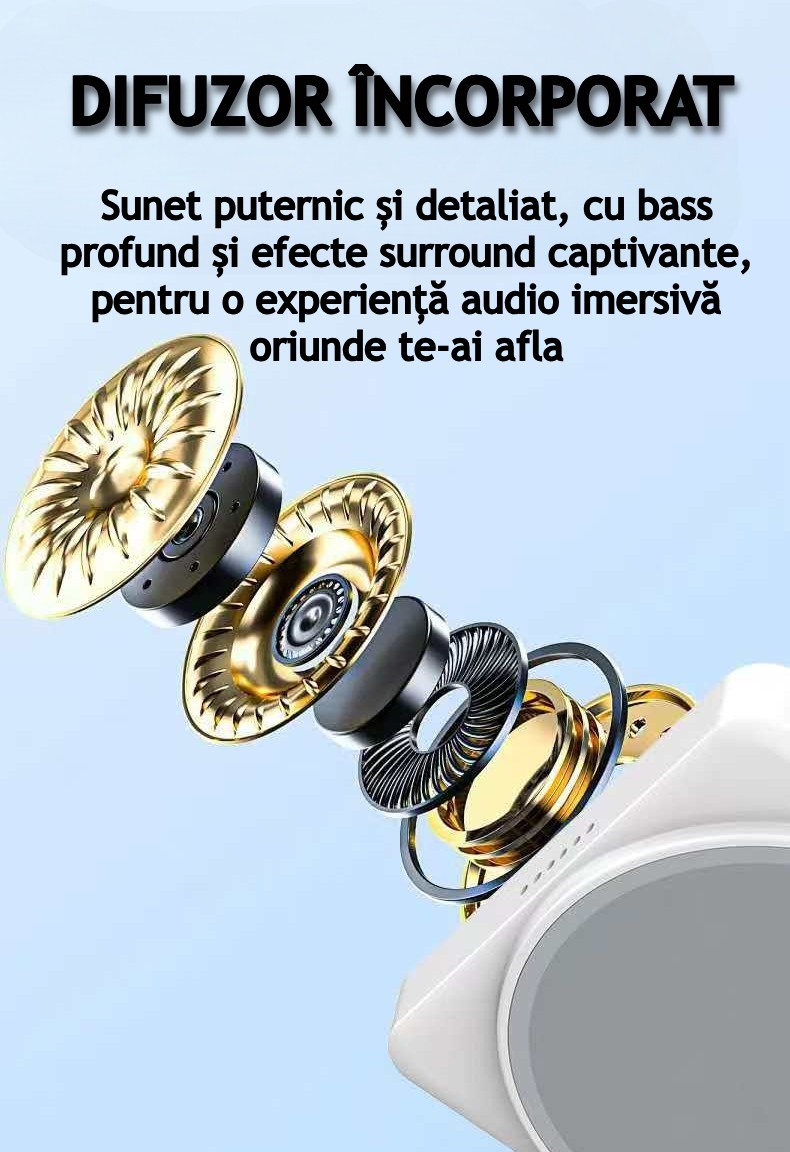 | Functii: | Prindere magnetica, Portabil, Telecomanda, Rotire automata ecran, Buton ON/OFF, Indicator baterie, Difuzor integrat, Bluetooth, Luminozitate ajustabila, Control tactil, Usor de utilizat |