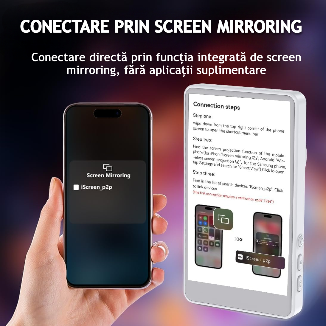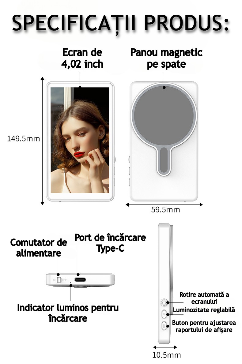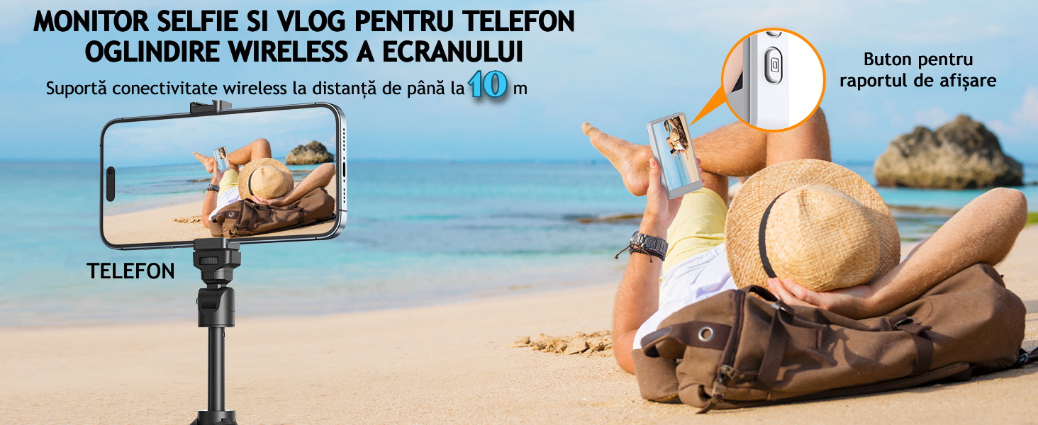 | Continut pachet: | 1 x Manual de utilizare, 1 x Cablu de incarcare, 1 x Monitor Selfie Wireless, 1 x Suport magnetic, 1 x Telecomanda bluetooth |